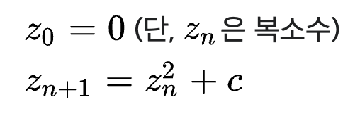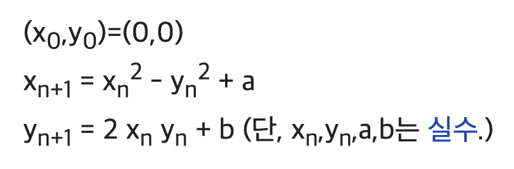 Mandelbrot : 정의된 수열이 발산하지 않는 성질을 갖도록 하는 복소수 c의 집합으로 정의