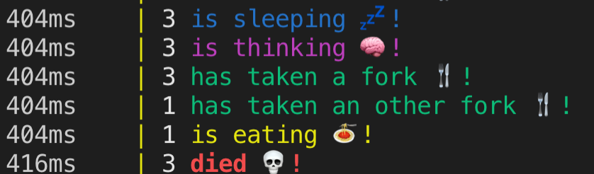 다른 문제의 경우는 출력하는 함수를 실행 시간 ms 와 철학자 본인의 번호 그리고 함수에서 입력받은 행동에 맞춰 출력을 두 개로 나뉘다 보니 가끔 출력하는 부분에서 중복이 되면서 밀리는 경우가 있었다.