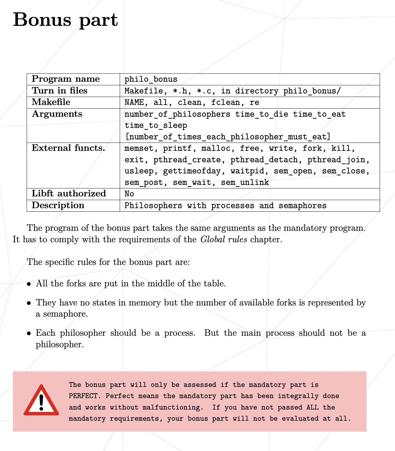 • Philosopher number 1 sits next to philosopher number number_of_philosophers. Any other philosopher number N sits between philosopher number N - 1 and philosopher number N + 1.
