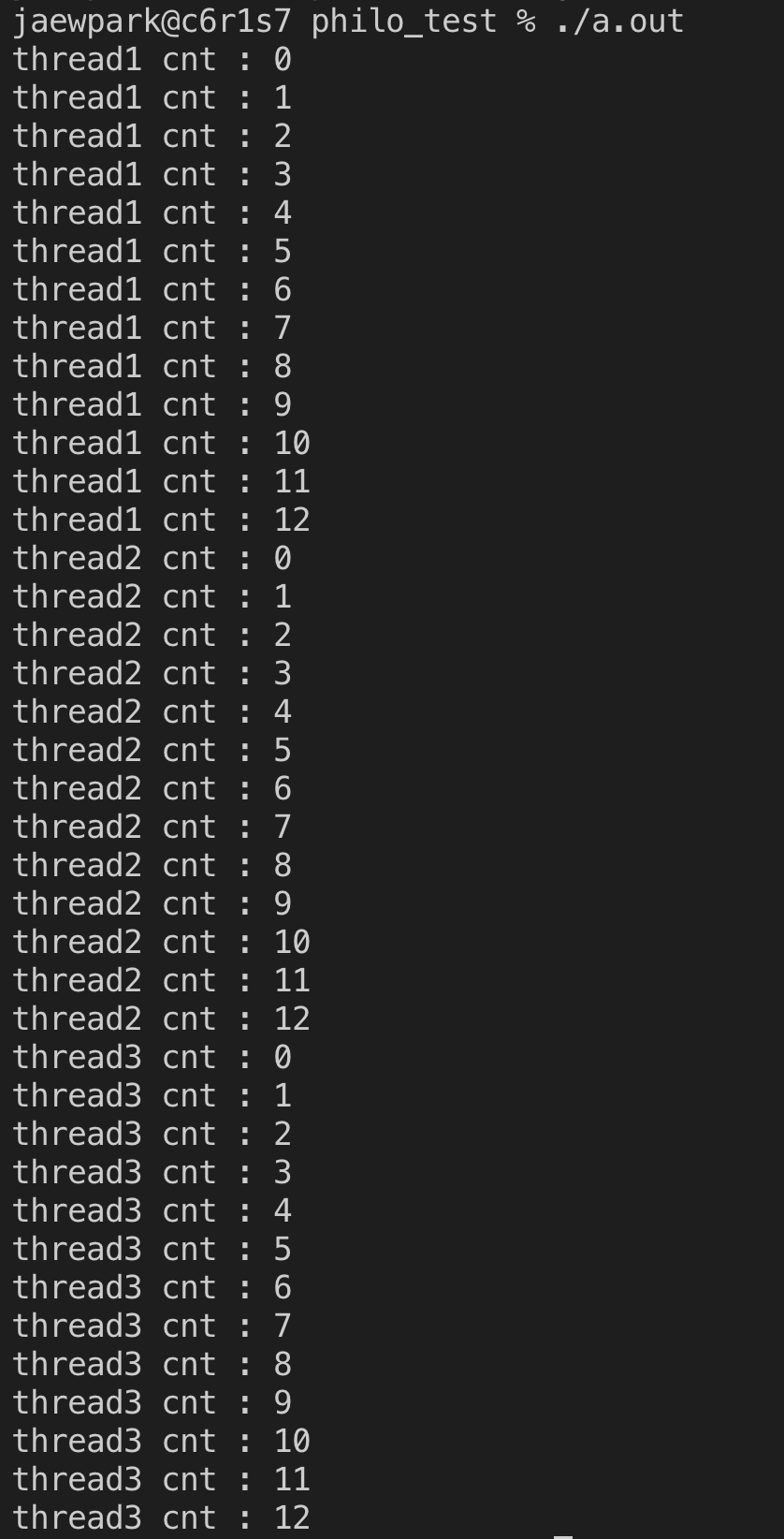 생각대로라면 thread1 - g_cnt가 0이 되었다가 다시 12까지 출력을 하고 thread2가 이것을 반복 되어야 하지만!!!