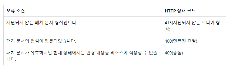 PATCH 요청은 기존 리소스에 부분 업데이트를 수행합니다. 클라이언트는 리소스의 URI를 지정합니다. 요청 본문은 리소스에 적용할 변경 내용을 지정, HTTP 의미 체계 준수