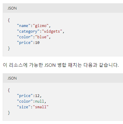 이는 서버에 price를 업데이트하고 color를 삭제하고 size를 추가하도록 지시하지만 name 및 category는 수정되지 않습니다. JSON 병합 패치의 정확한 세부 정보는 RFC 7396을 참조하세요.