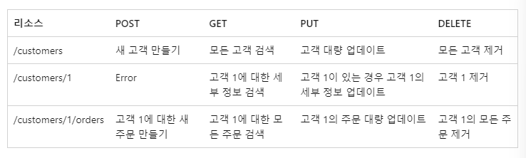 - HTTP를 기반으로 하는 REST API의 경우 리소스에 표준 HTTP 동사 수행 작업을 사용하는 것이 균일한 인터페이스에 포함, 일반적인 작업으로 GET, POST, PUT, PATCH 그리고 DELETE