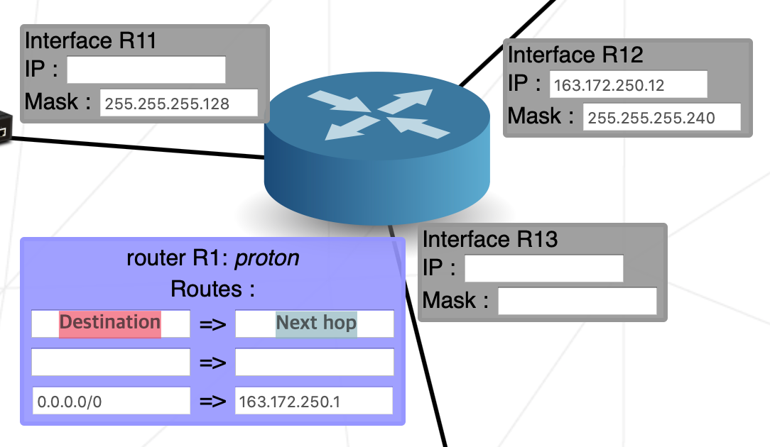 R13-R21, R23-D1, R22-C1 각 다른 네트워크를 기록하고 나면 R1 라우터가 남게 되는데, R1의 destination은 R2의 포함된 네트워크와 CIDR 입력하고 next hop 은 R21을 입력하면 됩니다.