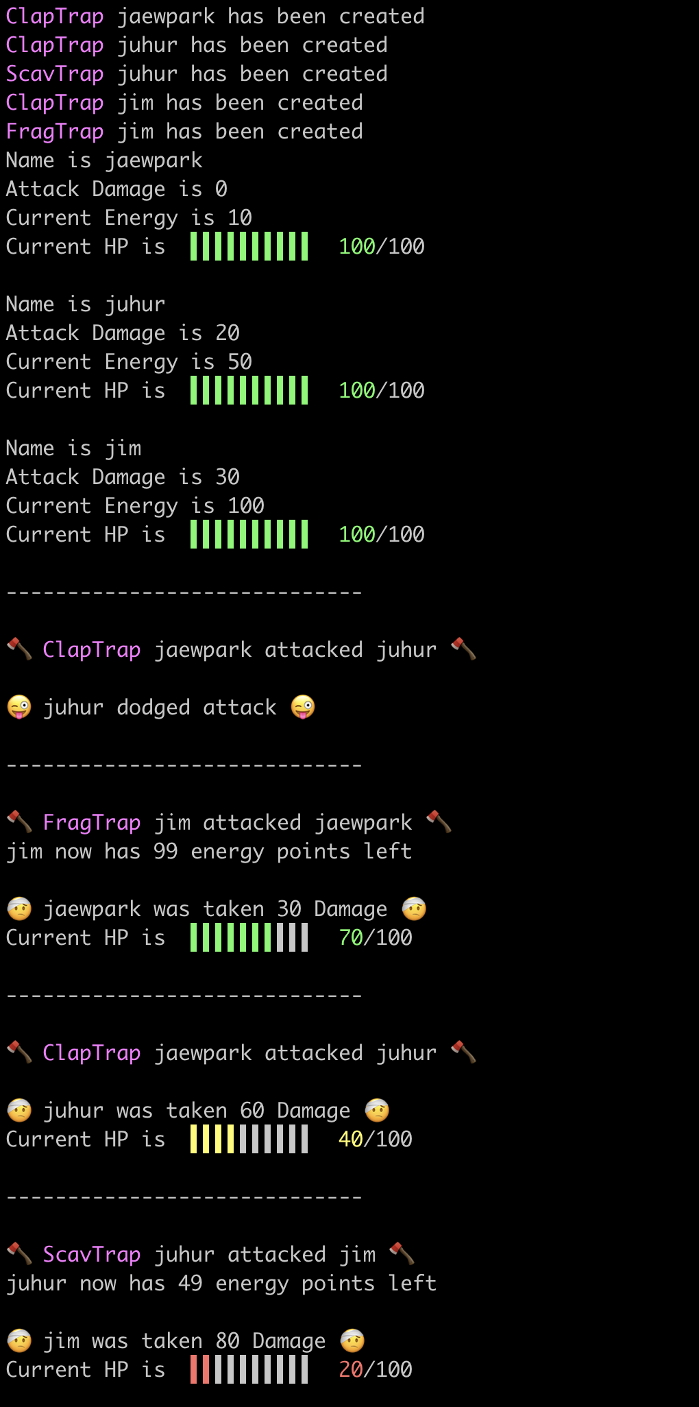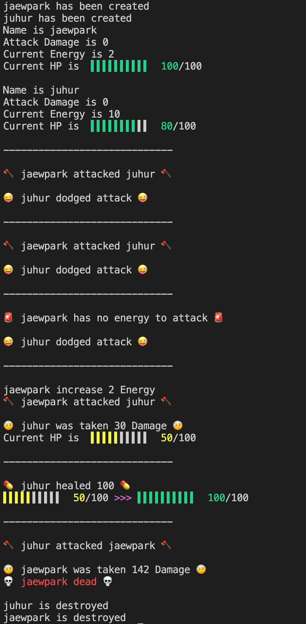attack 함수로 대상이 공격받는 것과 데미지 등을 출력해야 합니다.
