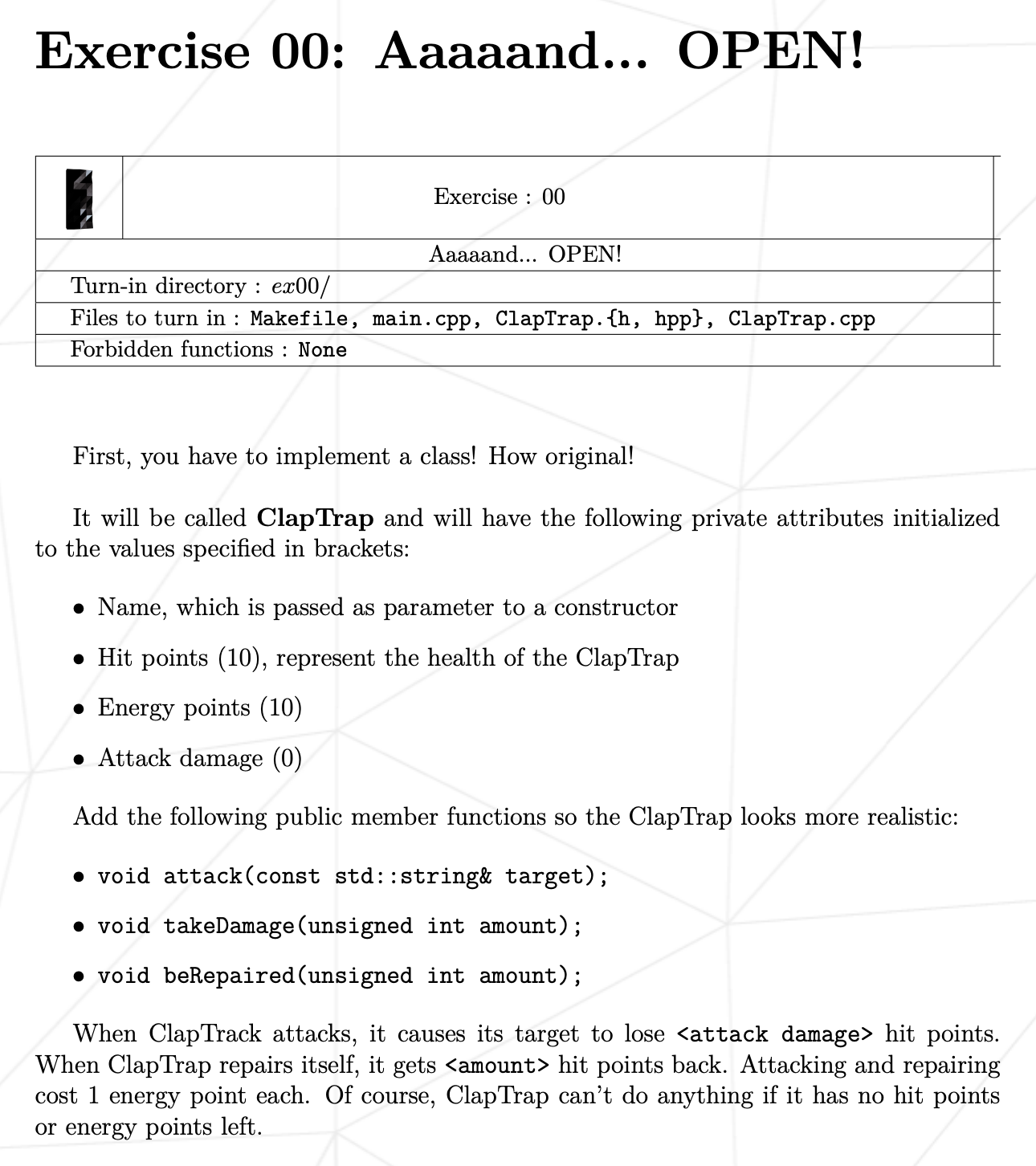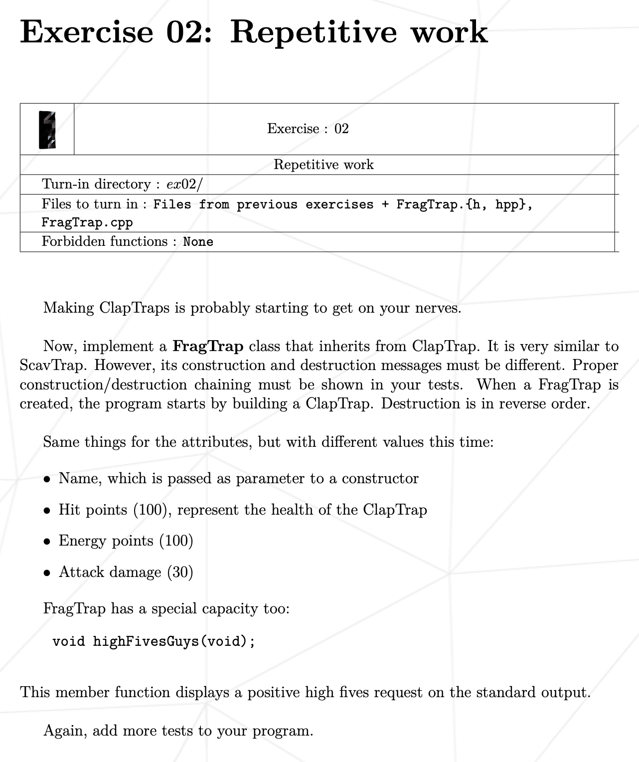 ClapTrap을 상속하는 FragTrap을 만들어야 합니다.