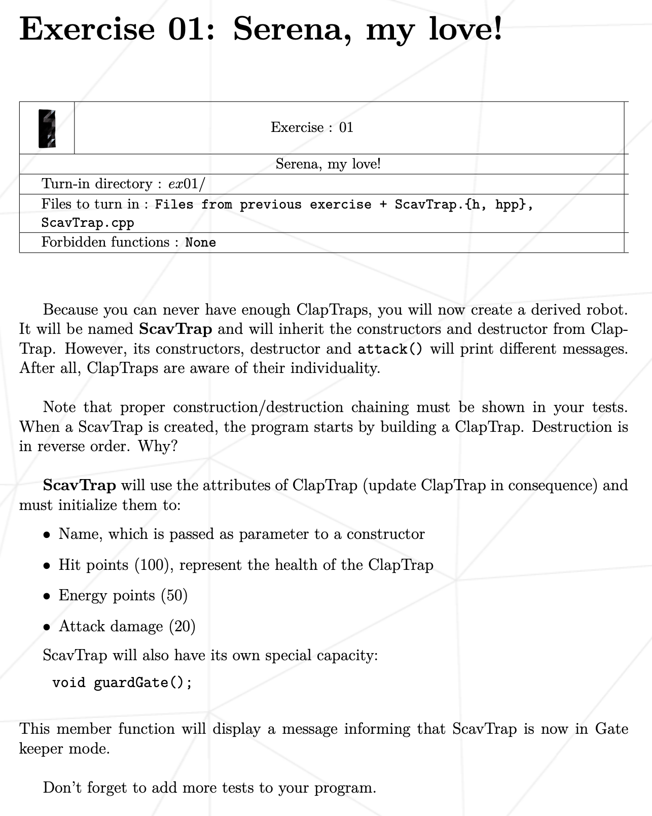 ScavTrap을 만들 때, ClapTrap을 만드는 것으로 시작해야합니다.