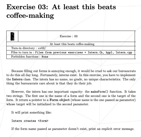 Intern 이라는 클래스를 만들고, 내부 멤버 함수 Form* makeForm(name of form, target of form) 를 만드세요.