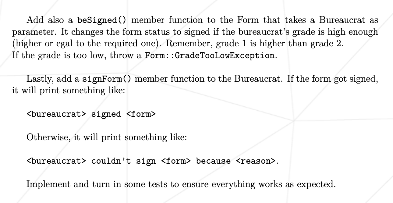 Add a signForm() member function to the Bureaucrat. 아래와 같이 출력되어야 합니다.