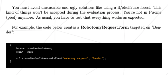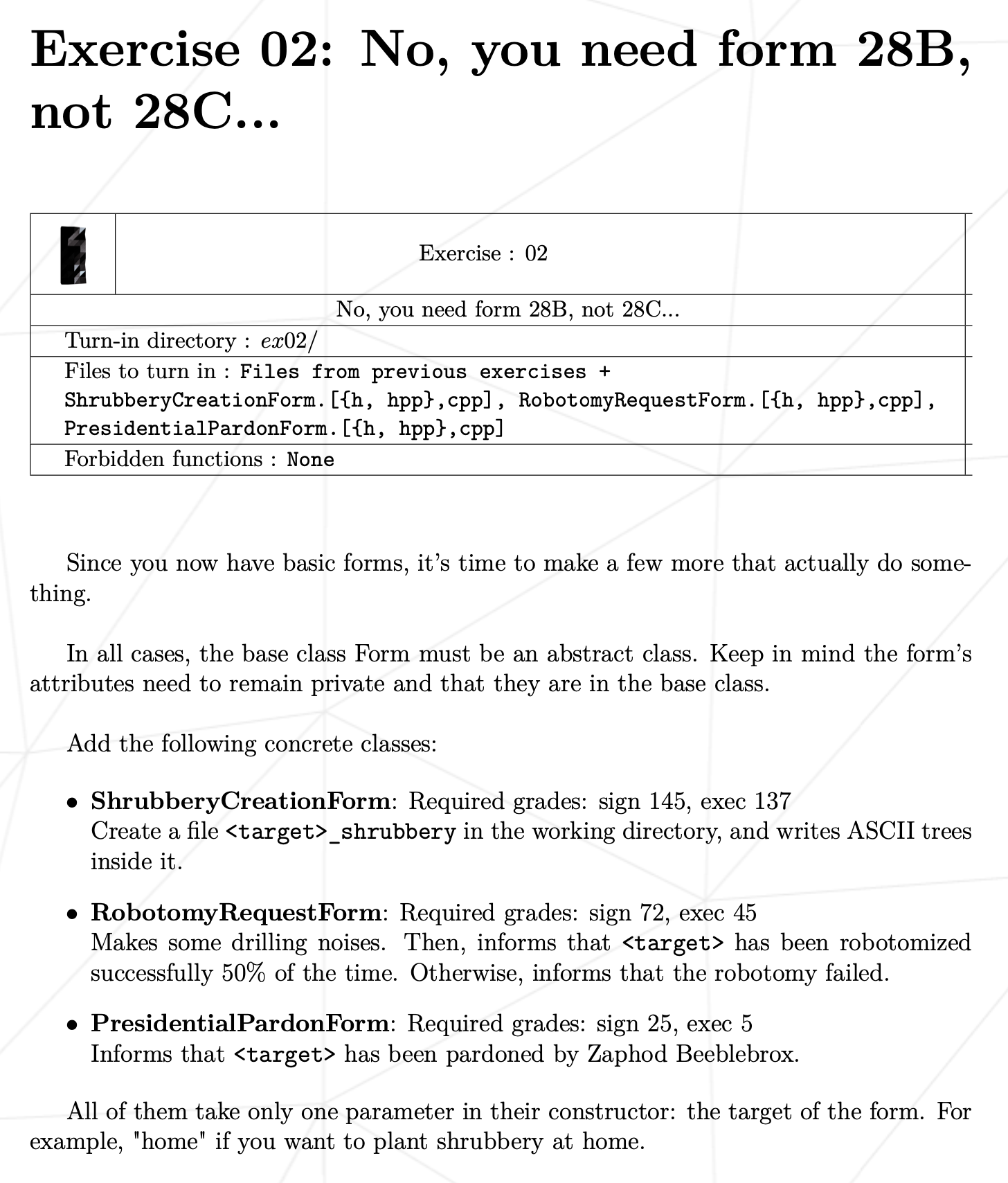 작업 디렉터리에 파일 <target>_shrubbery를 만들고 그 안에 ASCII 트리를 작성합니다. - RobotomyRequestForm: Required grades: sign 72, exec 45