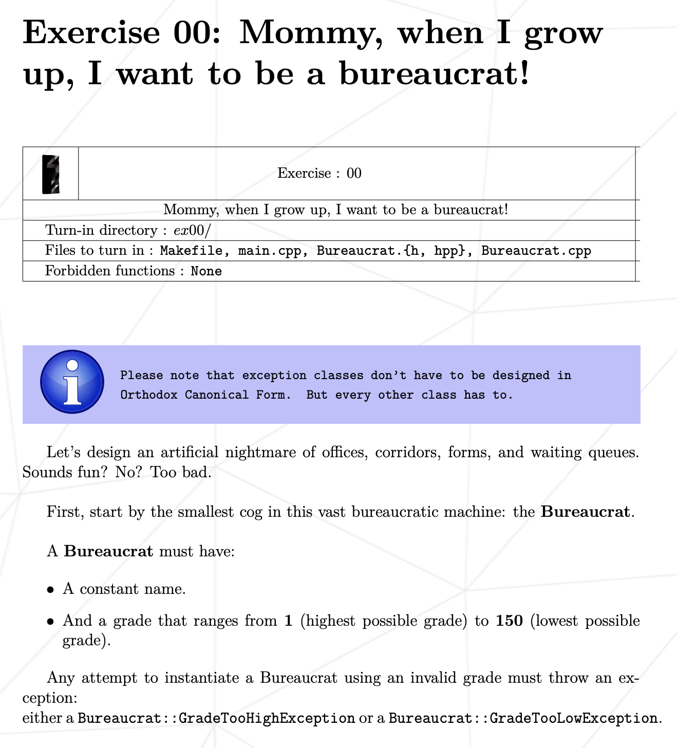 CPP05부터는 통과를 하기 위해서 Exercise03까지 진행을 해야합니다. 어떻게 알았냐구요? ... 알고 싶지 않았습니다