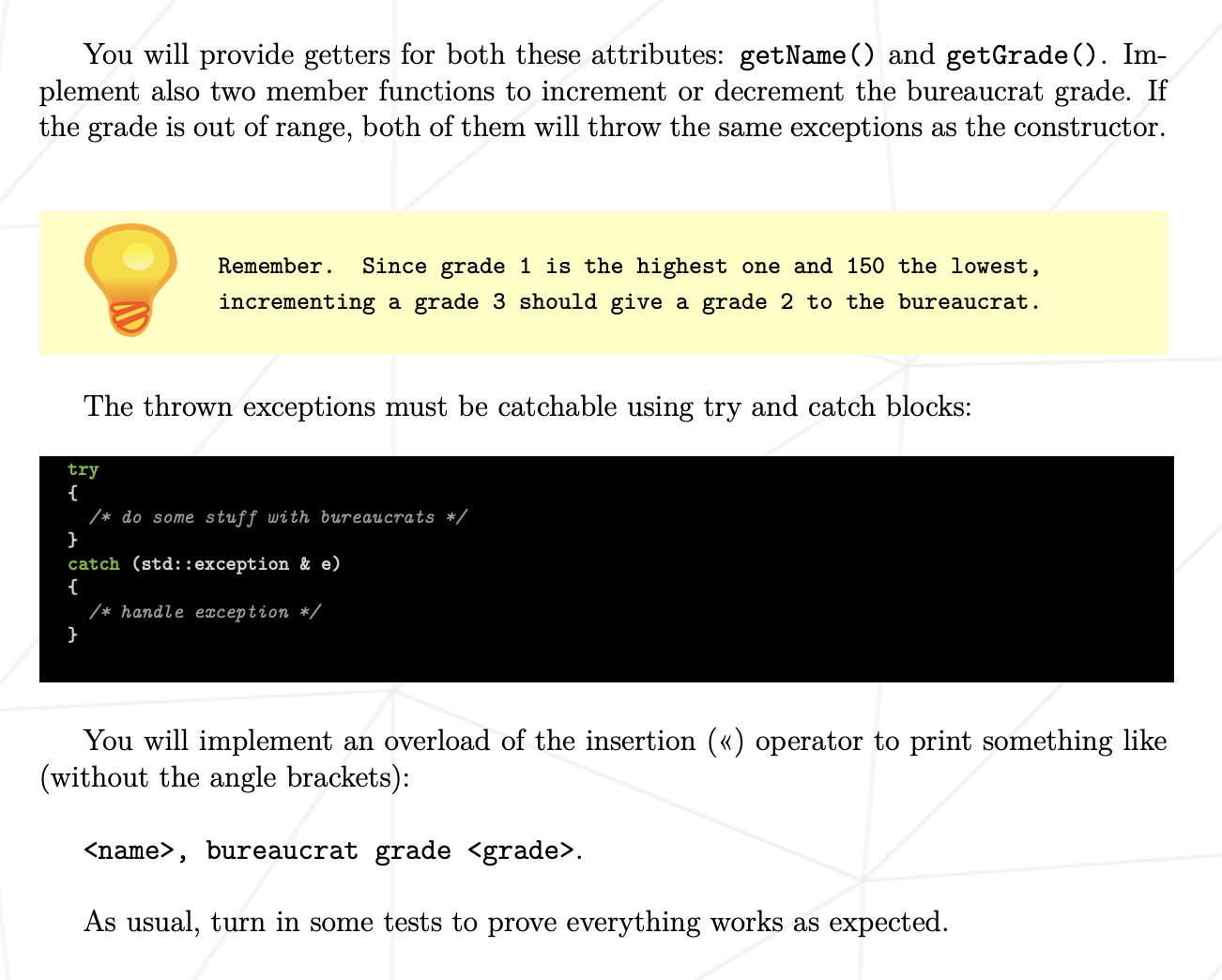ostream &operator<<(ostream &os,const Bureaucrat &bureaucrat);
