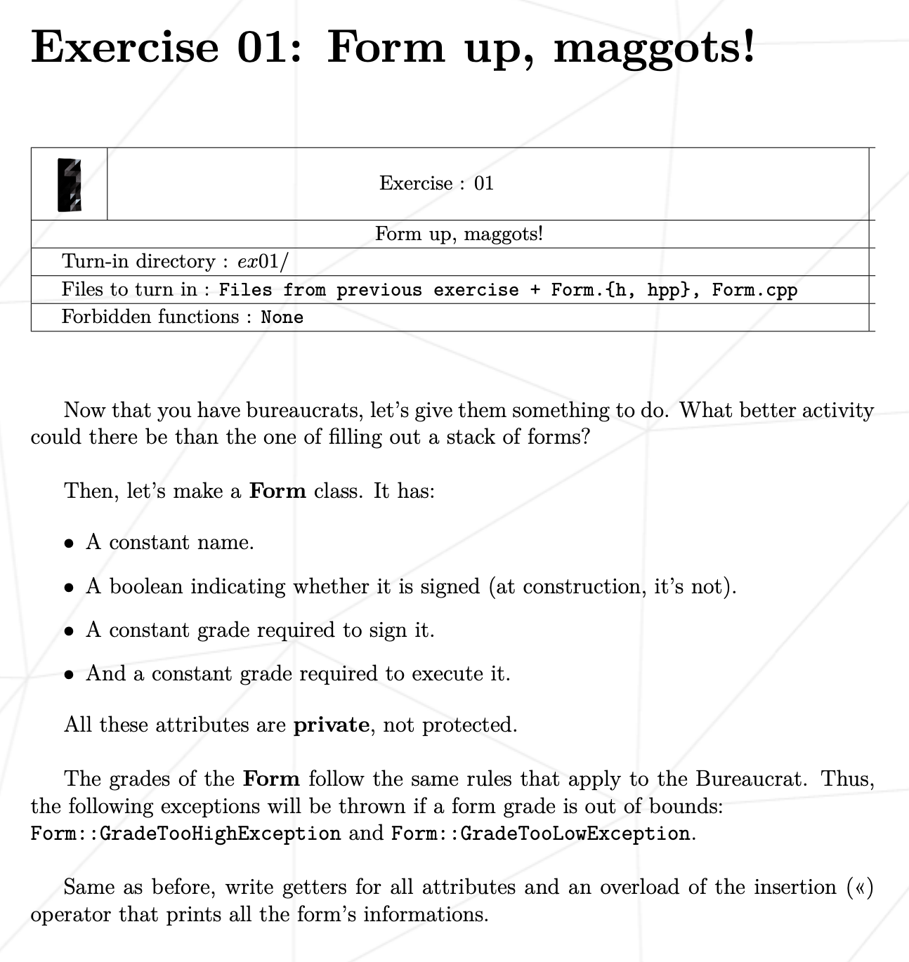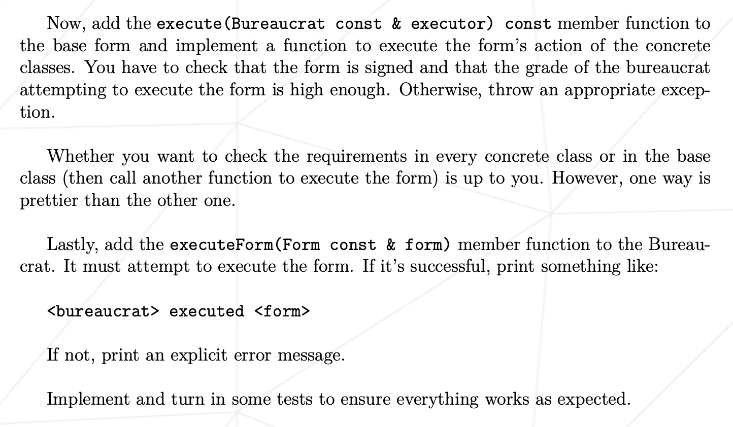 이제 기본 폼에 const execute(Bureaucrat const & executor) 멤버 함수를 추가하고 Form의 concrete classes동작을 실행하는 함수를 구현
