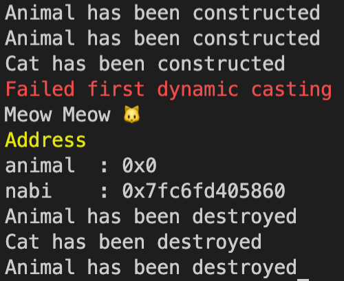 first dynamic_cast는 필수 클래스의 완전한 개체가 아니기 때문에 포인터를 캐스팅할 수 없습니다. 실패를 나타내기 위해 null 포인터를 반환합니다.