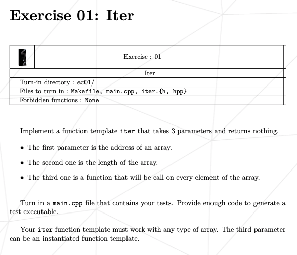 반복 함수 템플릿은 모든 유형의 배열과 함께 작동해야 합니다. 제3 파라미터는 인스턴스화된 함수 템플릿일 수 있다.