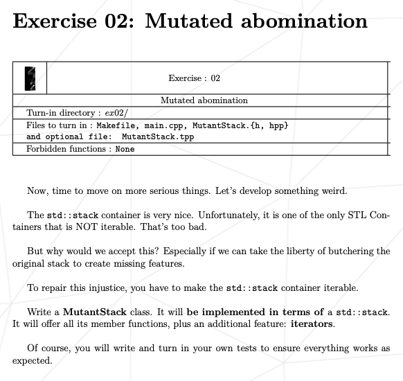 예를 들어, 만약 여러분이 MutantStack을 처음으로 실행하고, 그리고 두 번째로 std::list를 MutantStack이 있는 것으로 교체하는 경우, 두 출력이 동일해야 합니다.