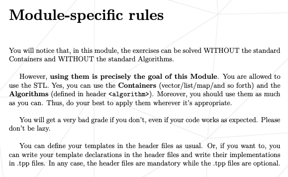 단, 이 모듈을 사용하는 것이 정확히 본 모듈의 목표입니다. STL을 사용할 수 있습니다. 예, 컨테이너(벡터/리스트/맵/등)와 알고리즘(헤더 <알고리즘>에 정의)을 사용할 수 있습니다. 게다가, 당신은 가능한 한 그것들을 많이 사용해야 합니다. 따라서, 적절한 곳에 적용하기 위해 최선을 다하세요.