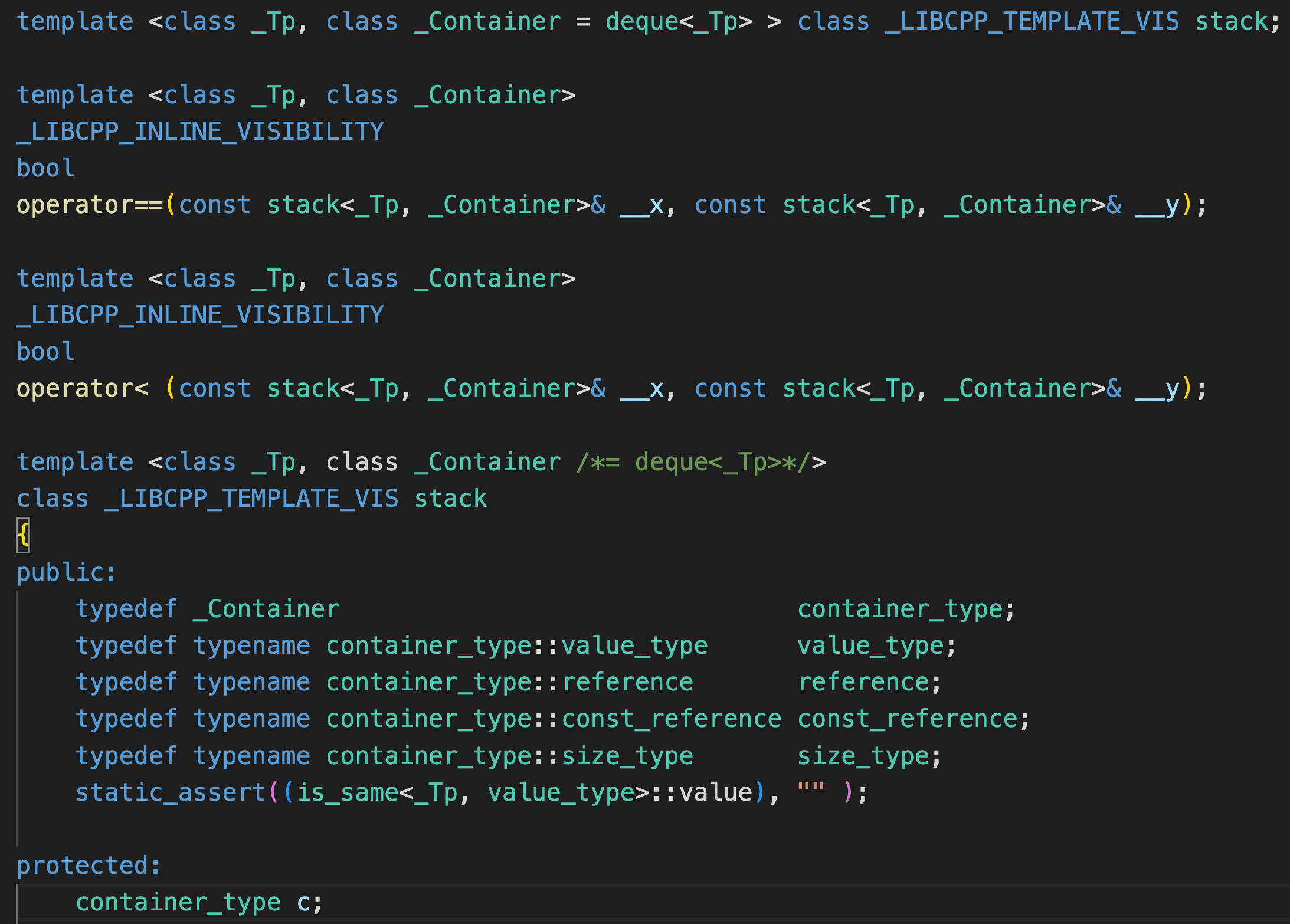 stack을 누르게 되면 class deque를 기본값으로 T 의 할당자 클래스 템플릿을 사용하는 것을 알 수 있습니다.
