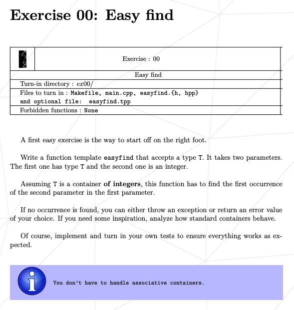 이 모듈에서는 표준 컨테이너와 표준 알고리즘 없이도 연습 문제를 해결할 수 있습니다.
