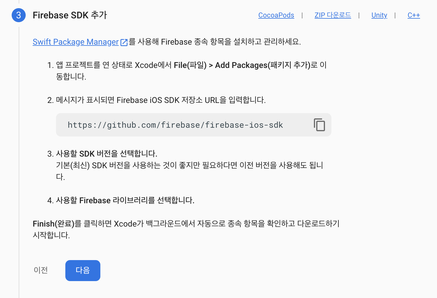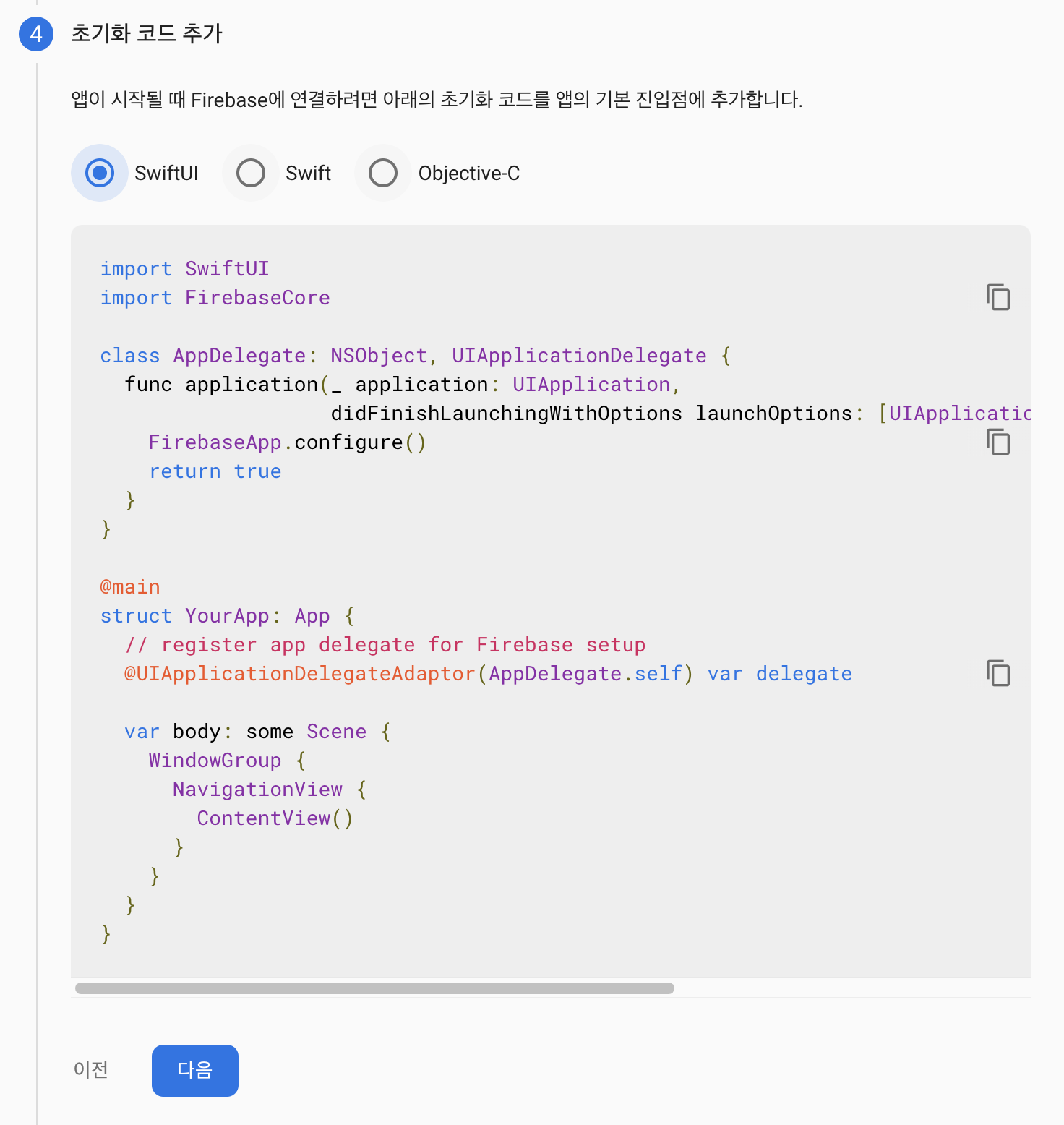 FireBase를 사용하는 프로젝트, SwiftUI 혹은 Swift에 맞게끔 초기화 코드를 추가하면 됩니다.