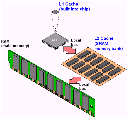 매우 빠르지만 상대적으로 작으며 일반적으로 프로세서 칩에 CPU 캐시로 내장된다.
