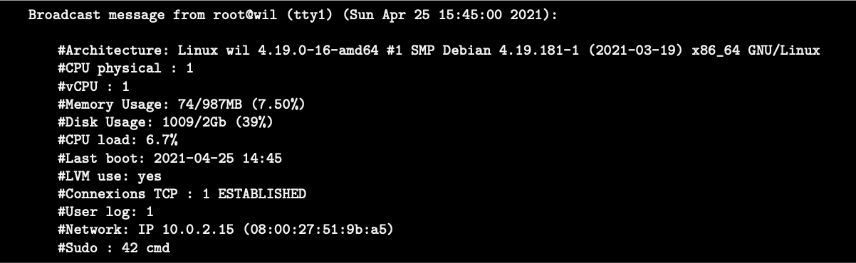 At server startup, the script will display some information (listed below) on all terminals every 10 minutes (take a look at wall). The banner is optional. No error must be visible.