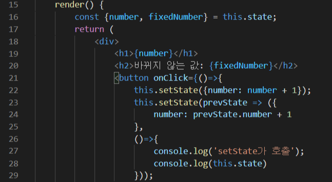 prevState 기존 상태, props 현재 지닌 props를 지칭